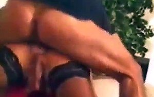Flaming busty tranny sucks huge cock