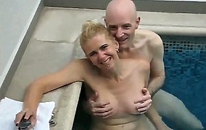 I fuck my beloved sadobitch in our private pool in front of our cuckold and she enjoys many orgasms, with the warm water surrounding us. After I play with her lovely tits and pussy.