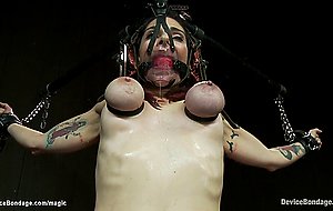 4:54Huge boobs redhead slave Annika is bound to metal triangle and nipples and tongue clamped then pussy tormented in other device by black master Jack Hammer